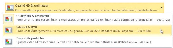 Avec PowerPoint 2010 vous pouvez créer une vidéo en format .wmv depuis votre présentation; cela peut éviter l’utilisation du programme PowerPoint viewer sur certaines plateformes (en particulier le Macintosh), de plus vous pourrez y incorporer, si nécessaire, la musique qui accompagne le diaporama.