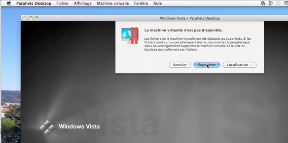 Pour supprimer une machine virtuelle, sélectionnez la machine (ici Windows Vista) et cliquez sur le bouton supprimer. Le bouton localisation sert à rechercher une machine virtuelle sur vos disques.