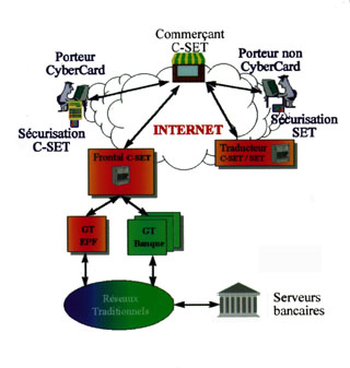 Opération de tests commencée depuis octobre 1997 par : le Crédit Agricole, le Crédit Mutuel, les Banques Populaires, La Poste, le CIC. Actuellement le système C-Set est en cours de convergence avec E-com (et donnera Cybercom, essai prévu fin novembre 1999, lancement en février 2000. 10/11/99 |