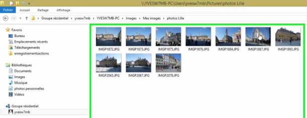 Depuis la tablette Surface j’ai accès aux photos du dossier Lille, du dossier Mes images, du PC YVESW7MB-PC, du groupe résidentiel yvesw7mb.