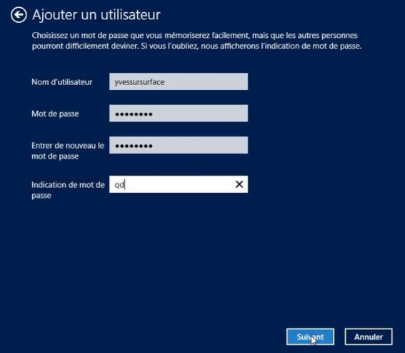 Je donne un nom d’utilisateur, un mot de passe et un indice pour le mot de passe.