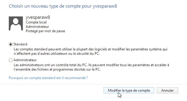 Pour modifier le type de compte (administrateur ou standard) allez dans le panneau de configuration > comptes utilisateurs > gérer un autre compte, choisissez le bouton radion Standard ou Administrateur.