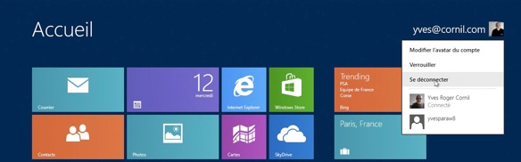 Pour déconnecter l’utilisateur Microsoft je vais dans l’écran accueil, utilisateur > se déconnecter.